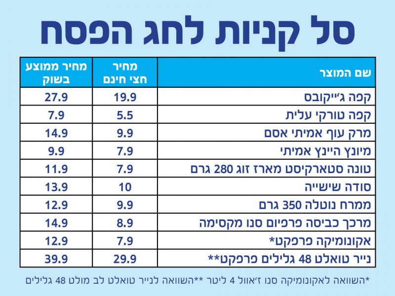 בימים אלה, לפני חג הפסח, כל הטוב הזה מתעצם: יותר מגוון, יותר מבצעים, יותר אפשרויות לכל סוגי המוצרים, כולל טריים, שמבטיחים ארוחת חג איכותית ללא פשרות. ההיצע והמגוון עולה על כל דמיון, רק לבחור, כל אחד וההעדפה שלו על פי המטבח הביתי. ואת כל זה אני מוצאת ב"חצי חינם" על ידי שורה של מבצעים, אטרקטיביים במיוחד, שאי אפשר לסרב להם. בעיקר לפני החג, בולטים המבצעים בכל המחלקות ולכל המוצרים, ולא רק בתחום האוכל.