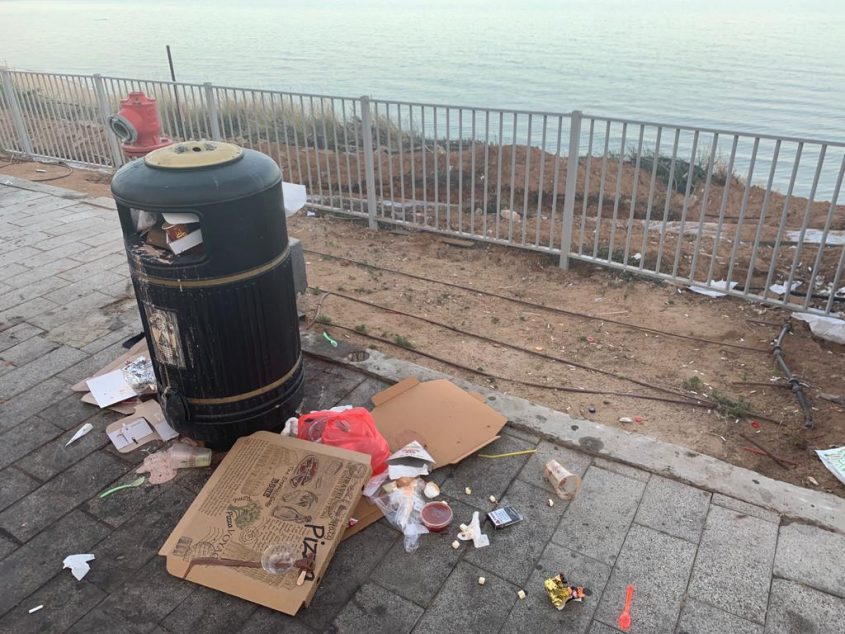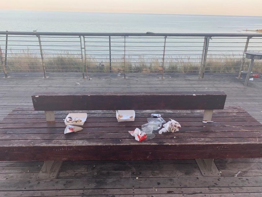 אבל לא רק בחופי הים הצטברו לכלוך ואשפה. גם הטיילת בבת ים העמוסה בבתי קפה ומסעדות נראתה מאוד לא נקייה. בין השאריות נמצאו מגשי פיצה, שאריות סושי, גלידות ומשקאות ועוד. ערימות האשפה גרמו לאנשים שיוצאים להליכות בוקר, לעצור ולתעד את הזוהמה.